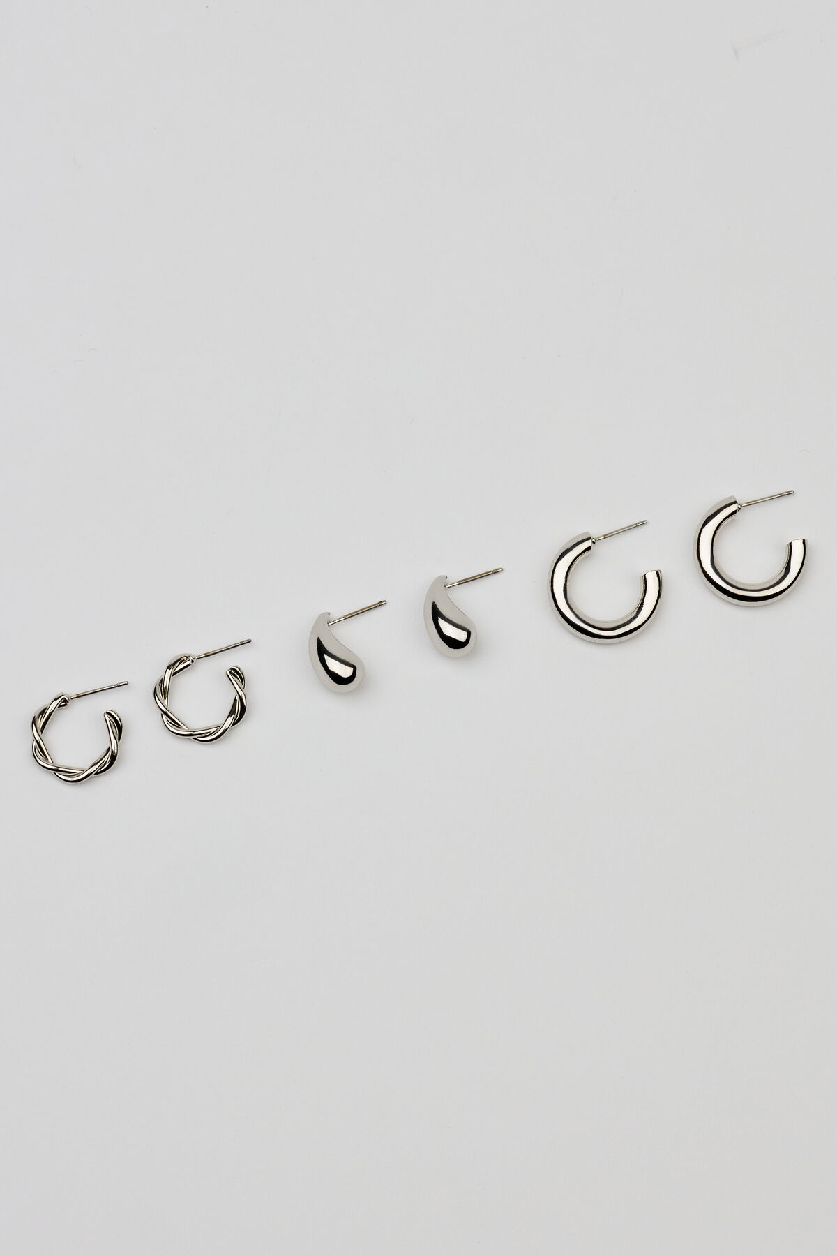 3 Pack of Twist Drop and Hoop Earrings Gray women – Okay, fashion. Features 3 sets of sculptural hoop and stud earrings Bullet backing Metal costume jewelry All jewelry is nickel, lead, and cadmium free Imported