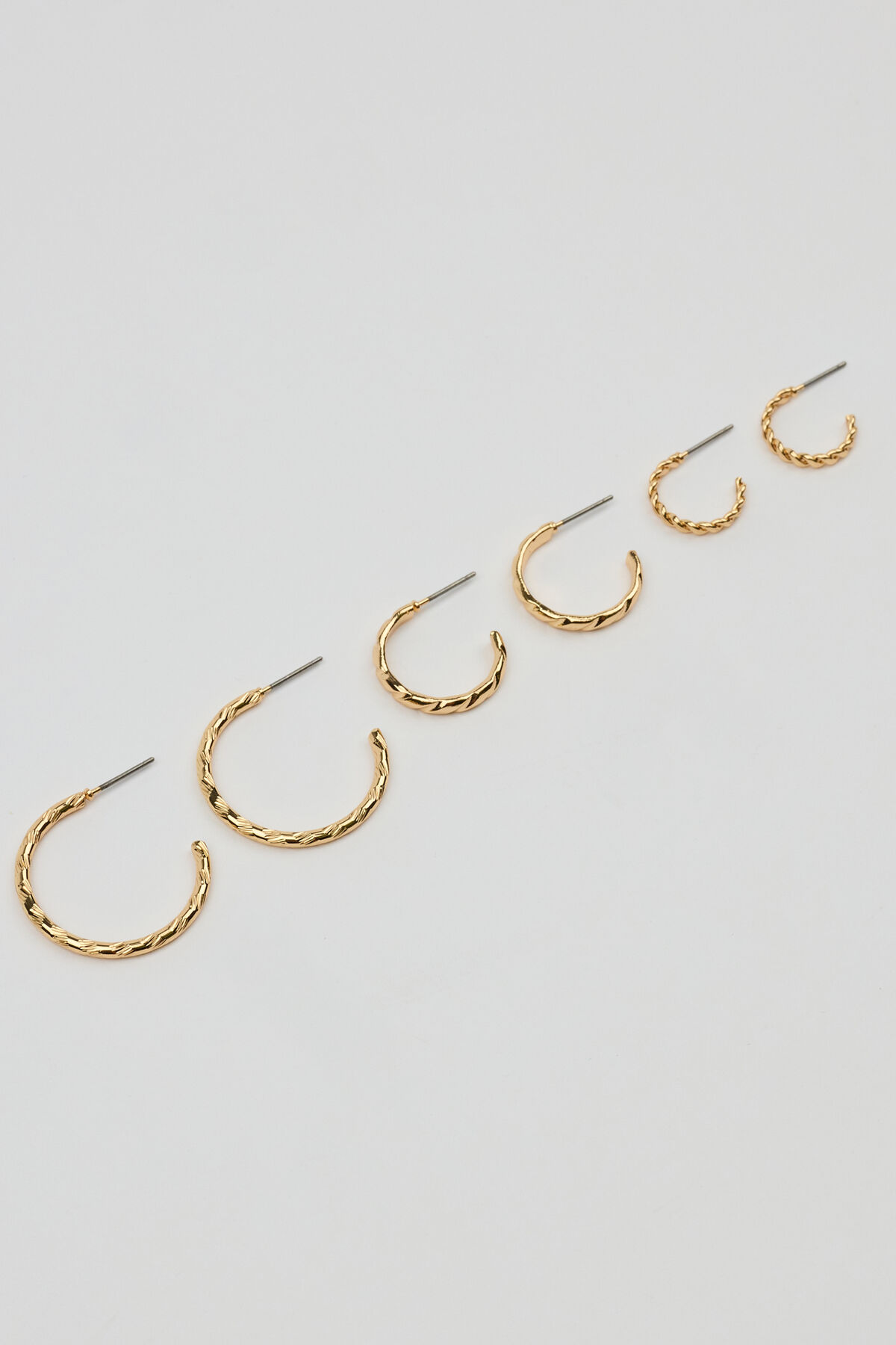 Set of 3 Textured Open Hoop Earrings YELLOW women – Making these my everyday pair. Features Set of 3 pairs Twisted hoop earrings Open back Bullet backing Metal costume jewelry All jewelry is lead, nickel, and cadmium free Imported