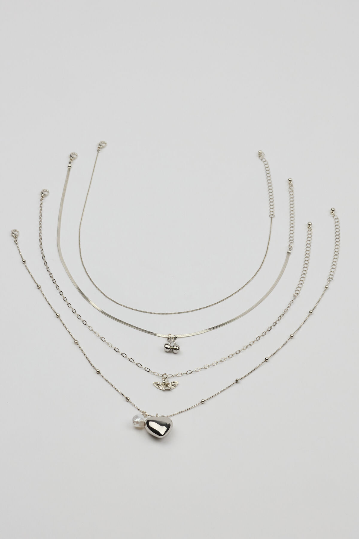 Set of 4 Angel and Cherry Pendant Necklaces Gray women – Need to show these off with an off-shoulder sweater . Features Chain link, snake chain, and beaded necklaces Adjustable lobster clasp fastening Angel, cherry, and heart charms Metal costume jewelry All jewelry is lead, nickel, and cadmium free Imported